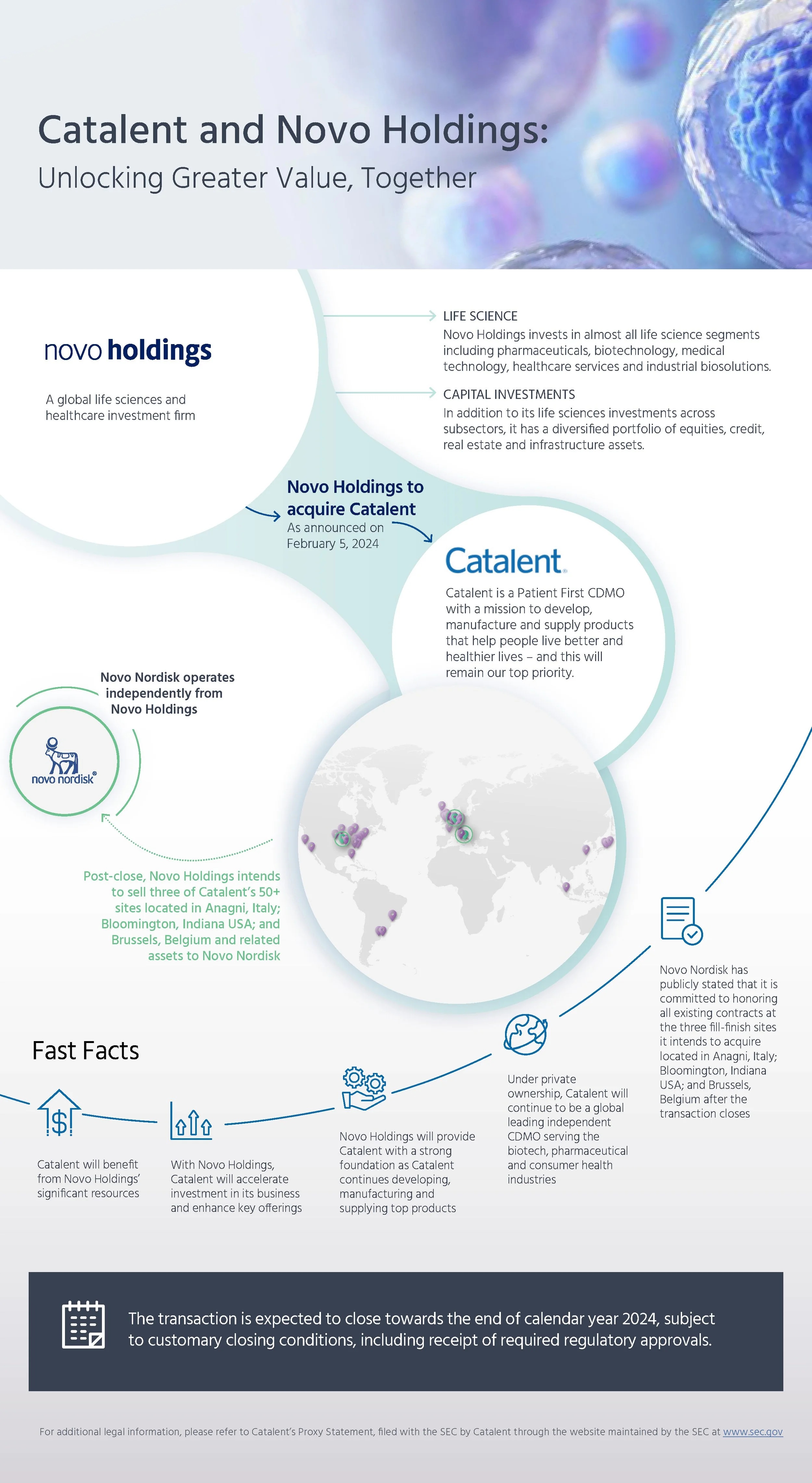 Following Catalent’s announcement of its acquisition by Novo Holdings, false rumors circulated suggesting that Catalent’s facilities would be sold to Novo Nordisk, raising investor concerns about the potential impact on the value of their investment. We created this infographic to clarify that Novo Holdings and Novo Nordisk are separate entities and to demonstrate that Catalent would continue to operate as an independent company under Novo Holdings.